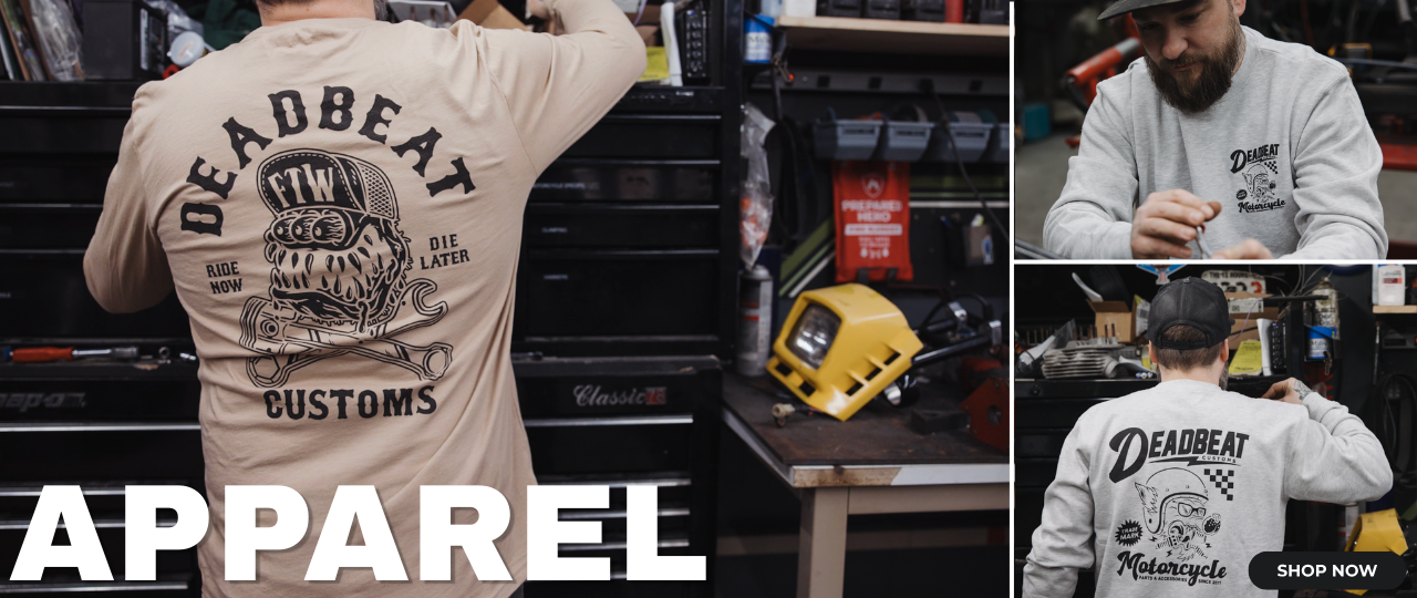 Deadbeat Customs is THE Harley Davidson parts and motorcycle gear source for people who like to pick up a wrench and get their hands dirty working on their bikes. Whether you're looking to add a personal touch to your ride or build a custom chopper from scratch, we've got all the Harley parts and motorcycle gear you need to hit the road and ride the way you want.