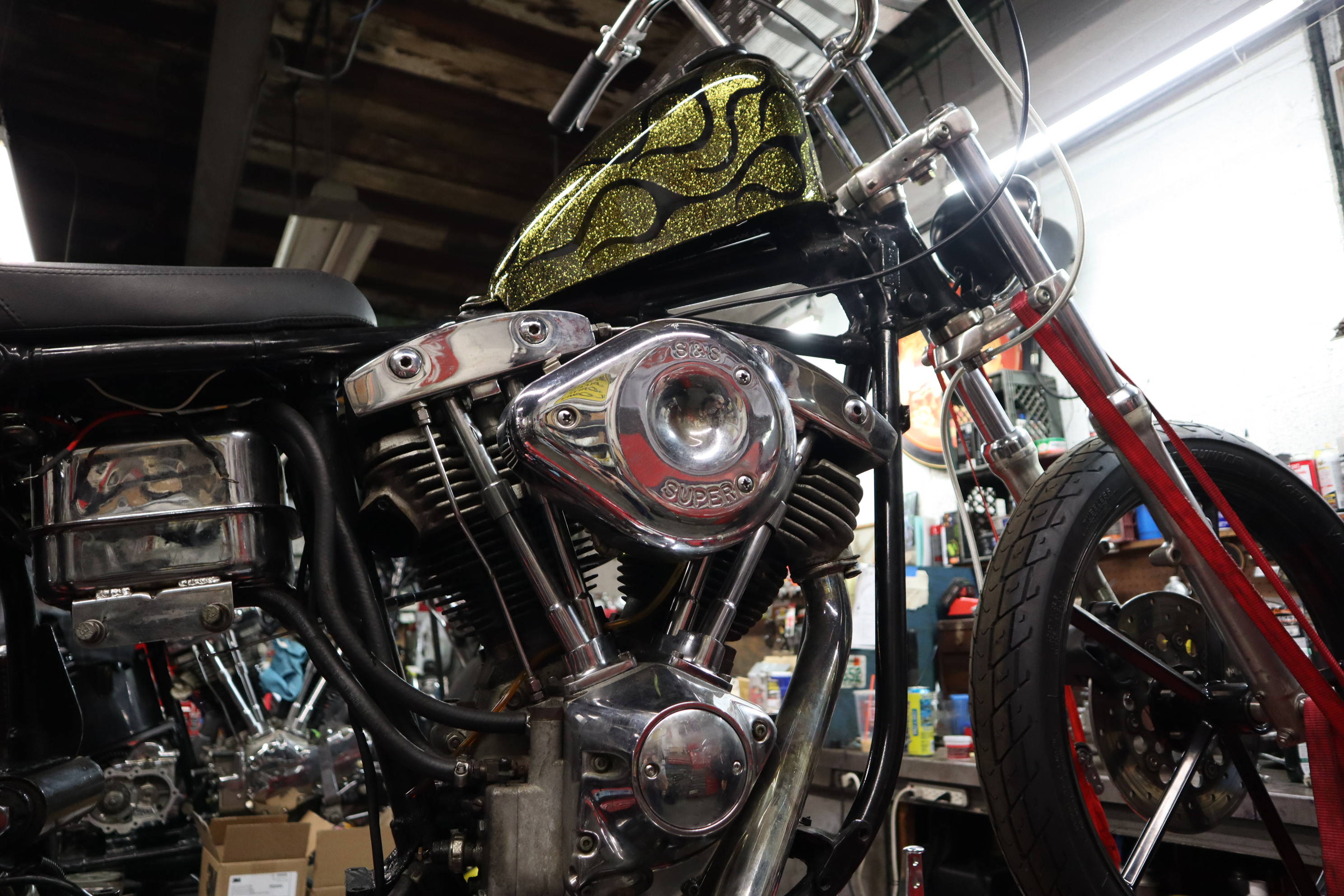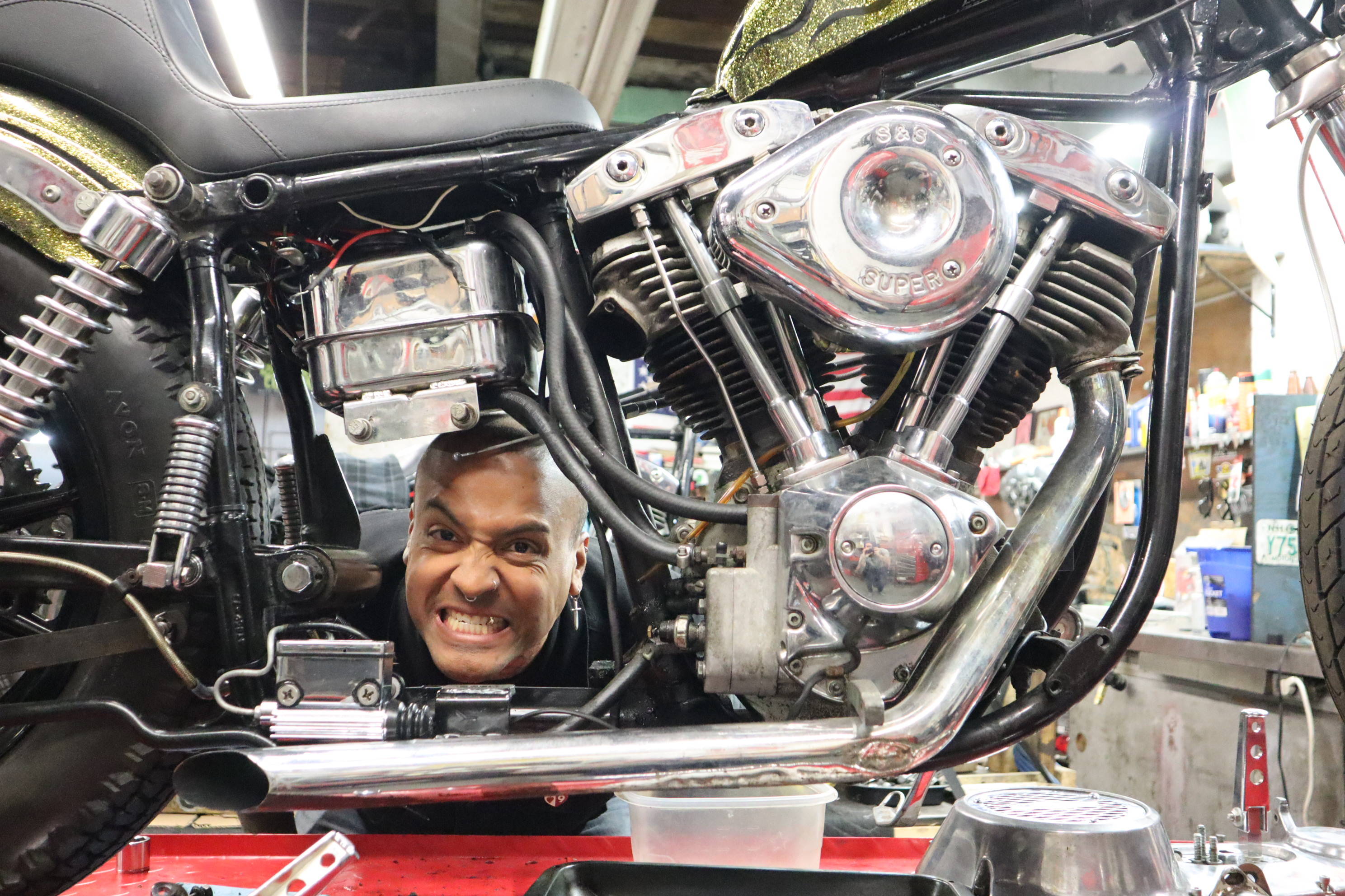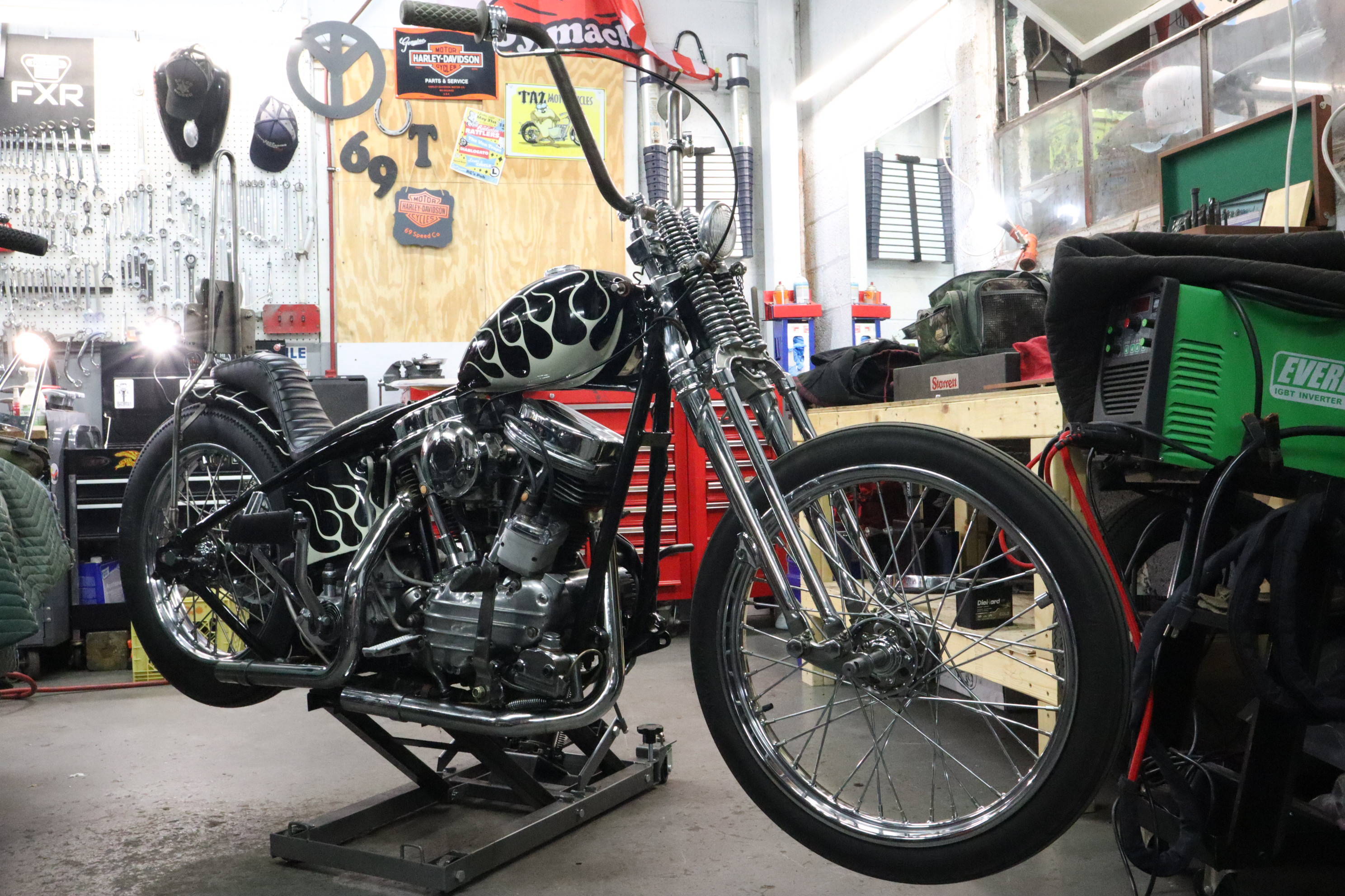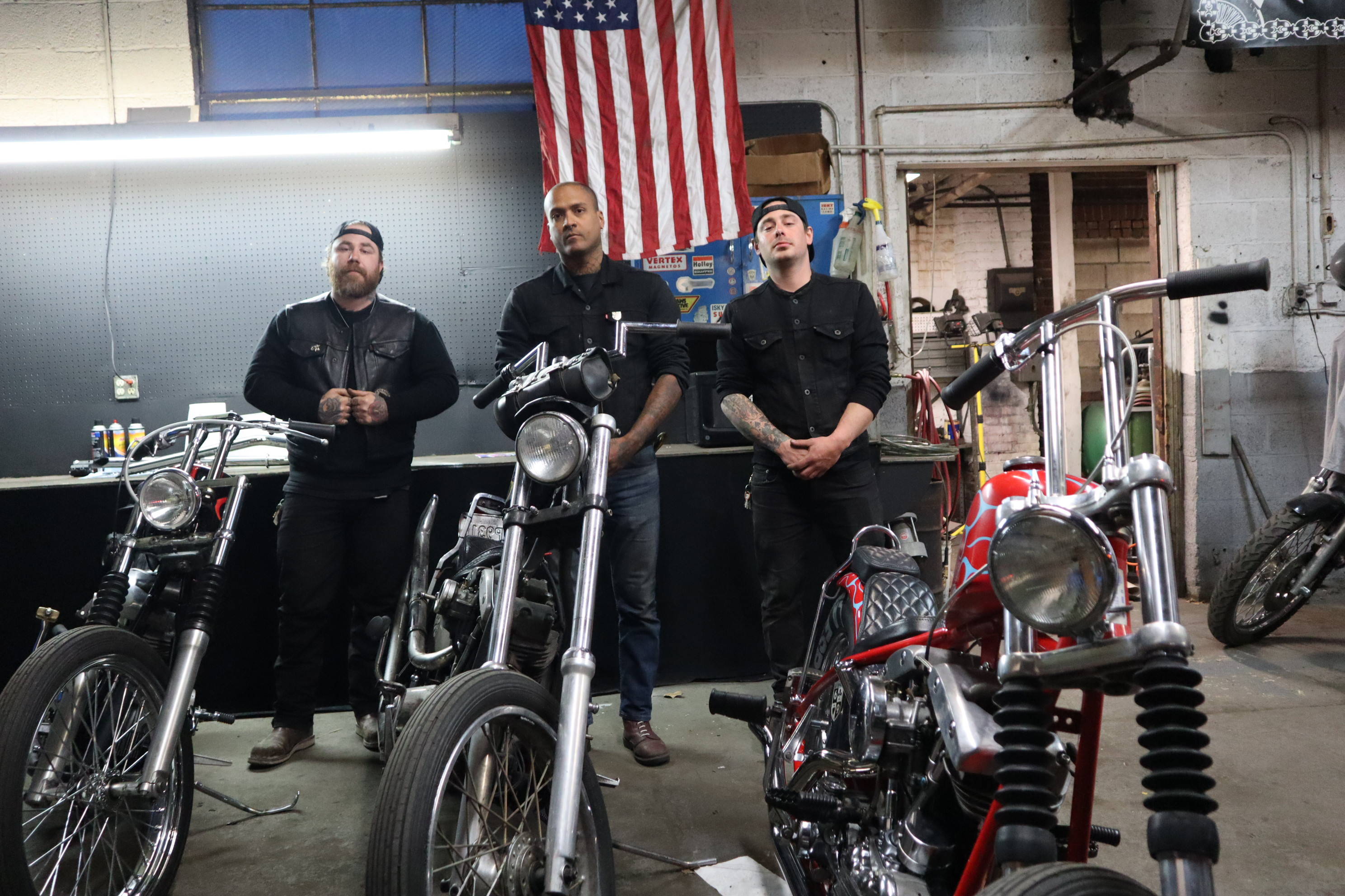 Hey its Dorian (@dorianmphoto) from Deadbeat Customs, I took a ride out to Haverhill MA last weekend to check out the Speed Boys shop and see whats going on with the big show they are putting on. The La Espada Chopper Show will be held 4/30/22 and is going to be a big one. With this being their first show they have ever put on I thought it was worth documenting. Everyone at the shop was buttoning up their choppers to get ready, the guys were super cool and even let me take their foot clutch chopper aroung the block. I grabbed a few shots of the place and we talked bikes, repairs, and how long they have been into choppers.