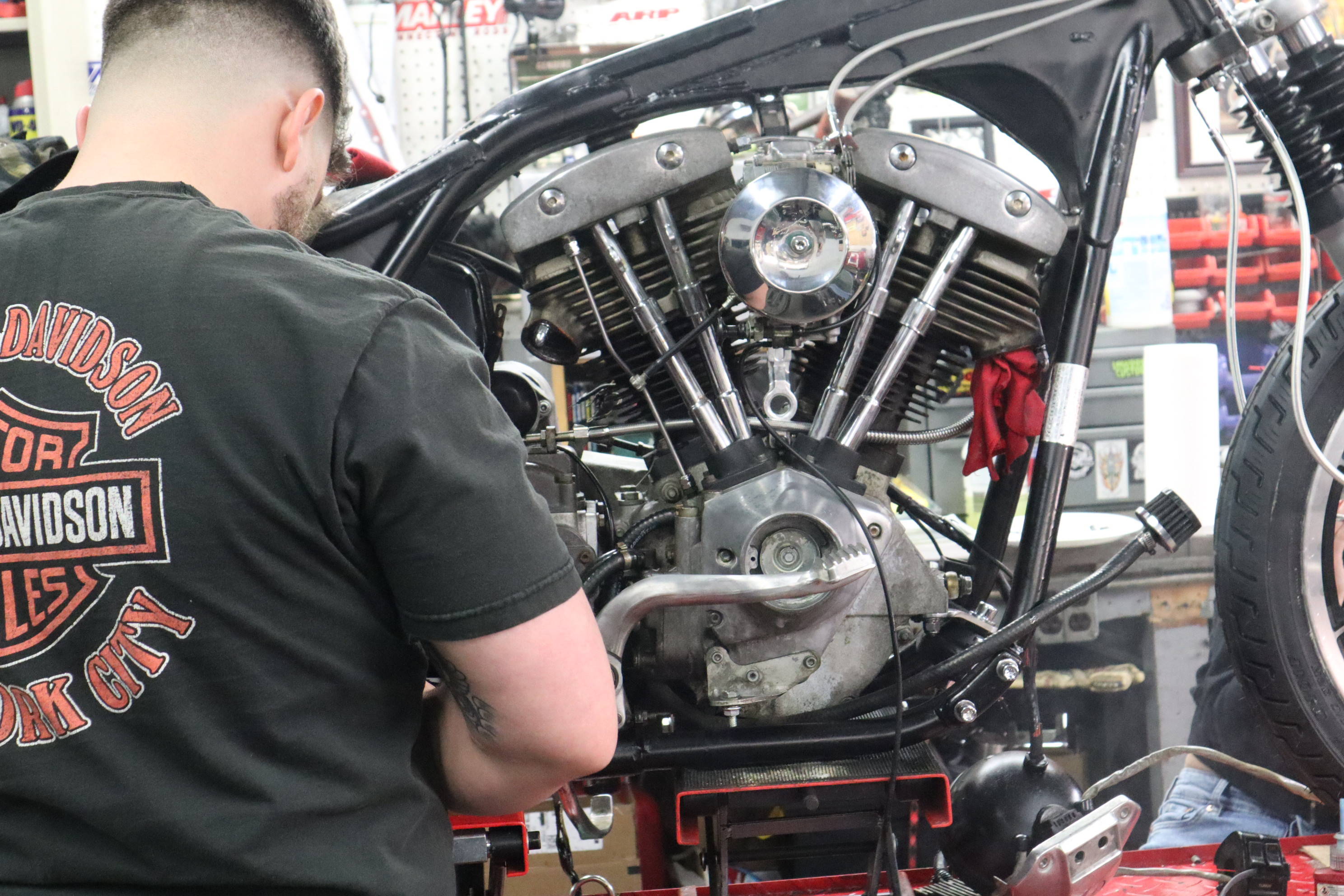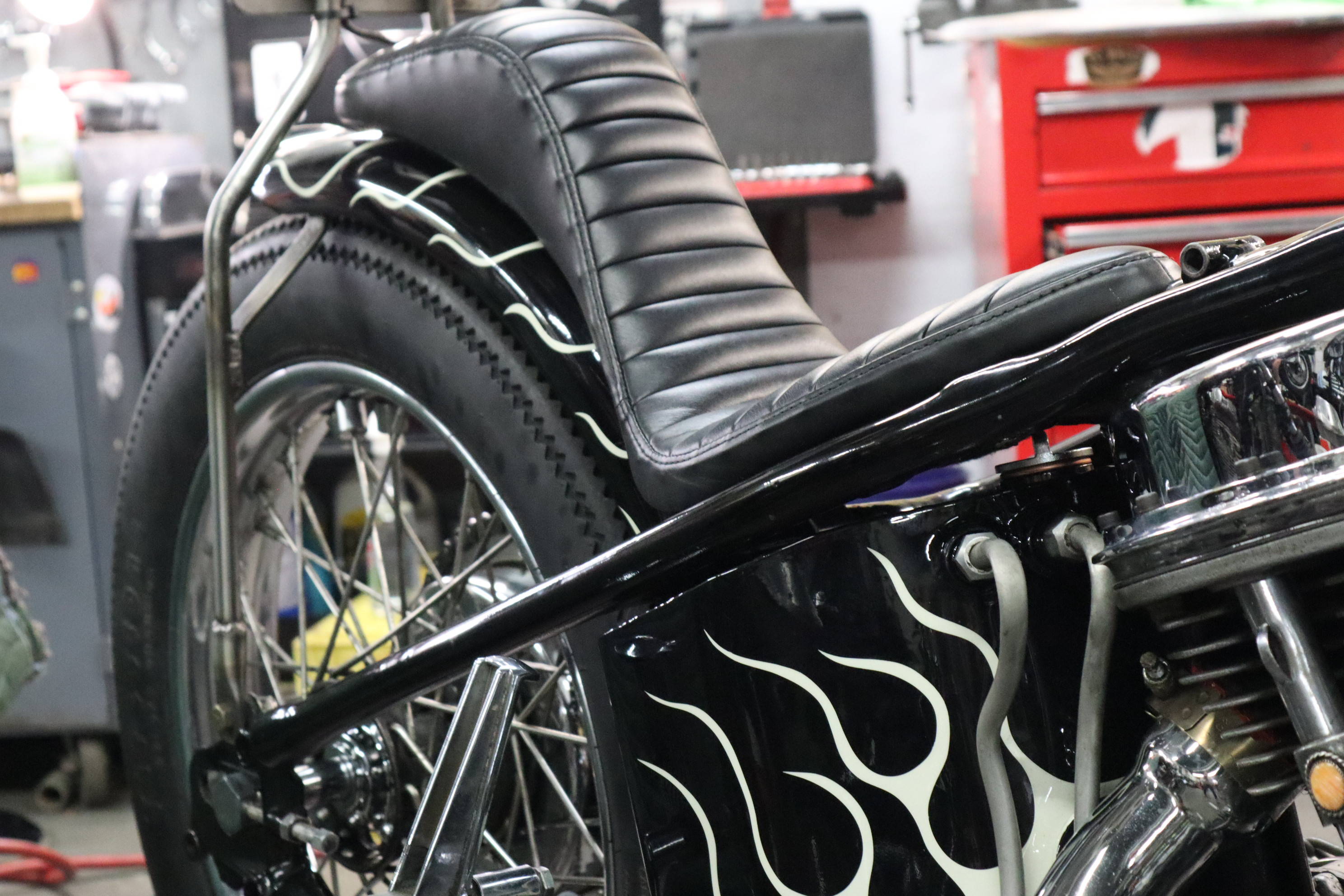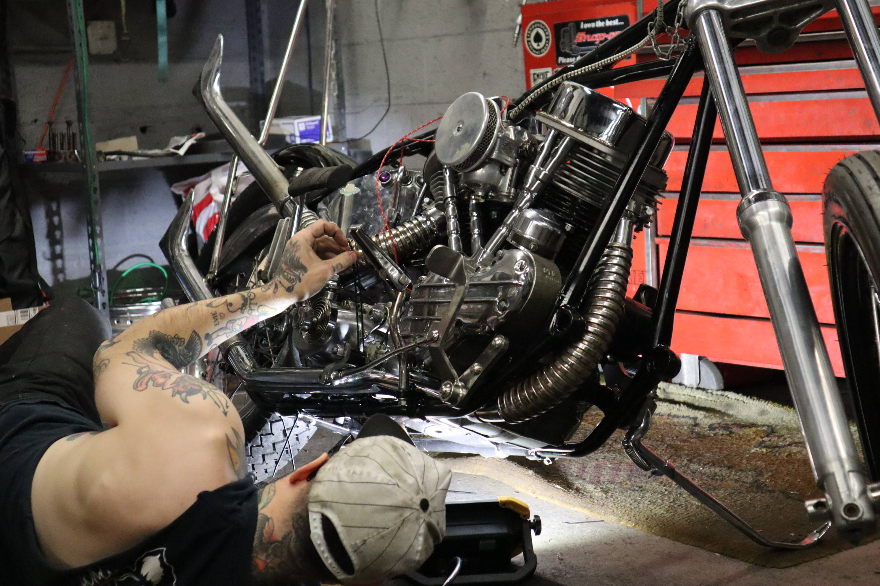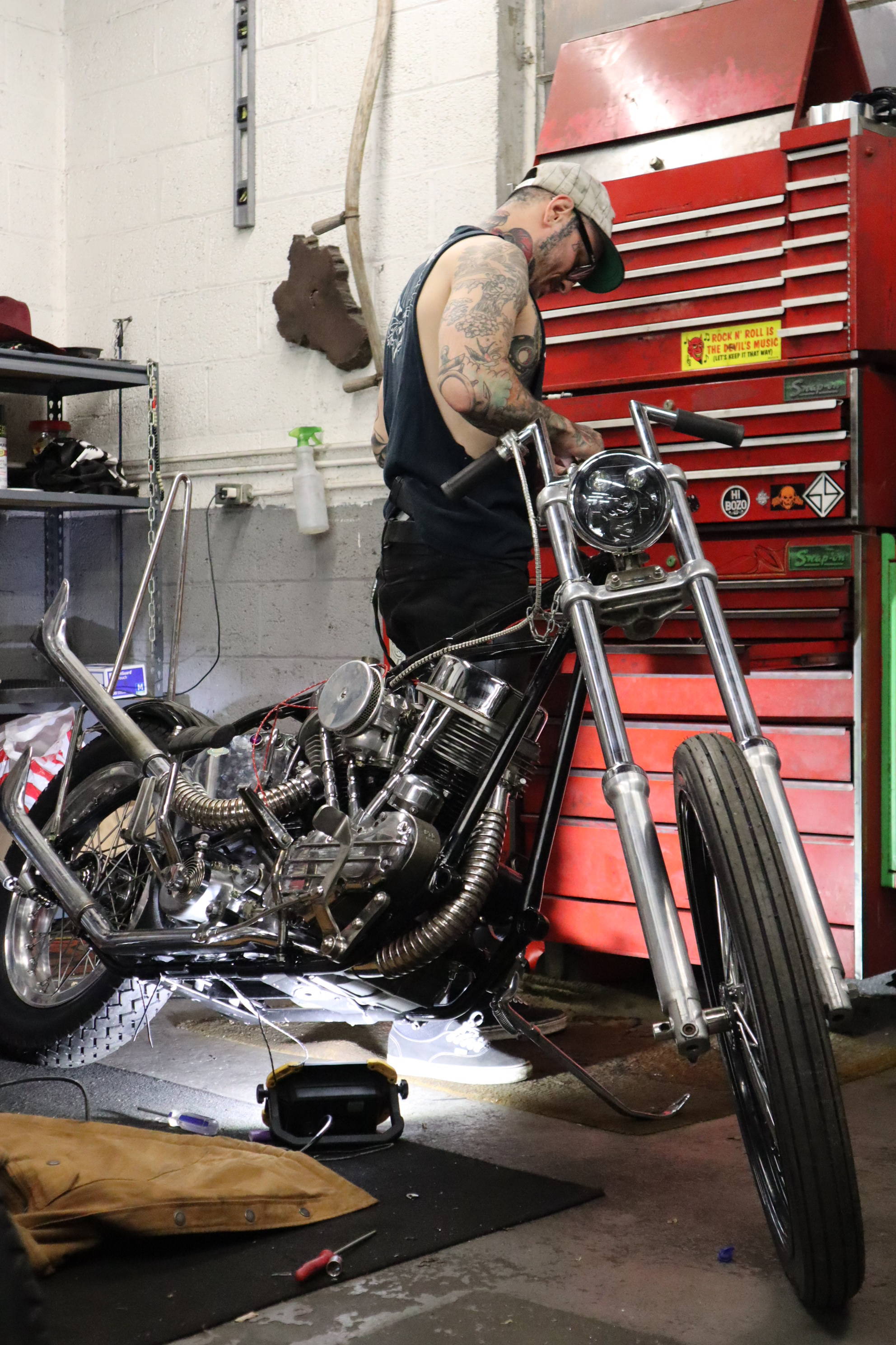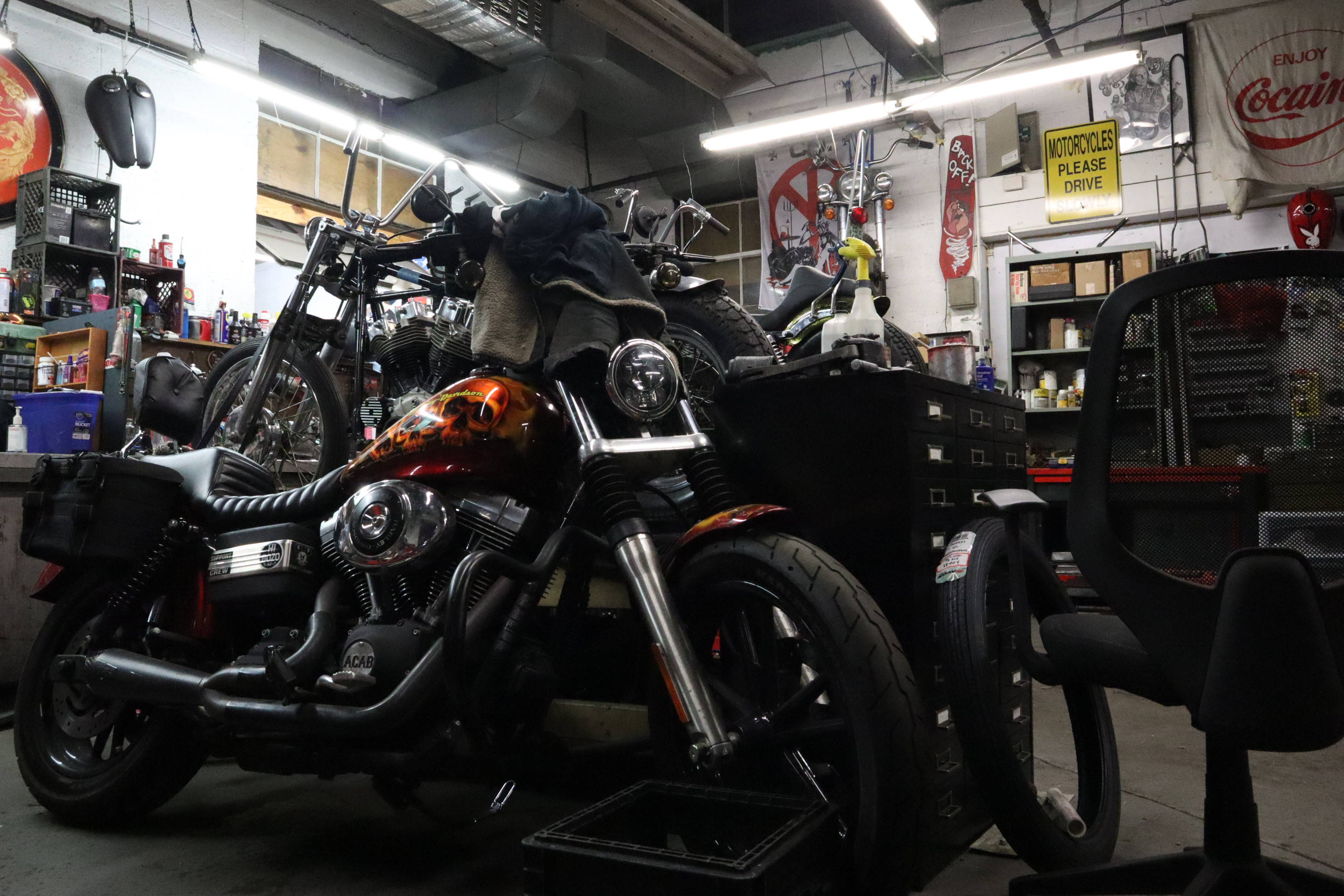 Hey its Dorian (@dorianmphoto) from Deadbeat Customs, I took a ride out to Haverhill MA last weekend to check out the Speed Boys shop and see whats going on with the big show they are putting on. The La Espada Chopper Show will be held 4/30/22 and is going to be a big one. With this being their first show they have ever put on I thought it was worth documenting. Everyone at the shop was buttoning up their choppers to get ready, the guys were super cool and even let me take their foot clutch chopper aroung the block. I grabbed a few shots of the place and we talked bikes, repairs, and how long they have been into choppers.